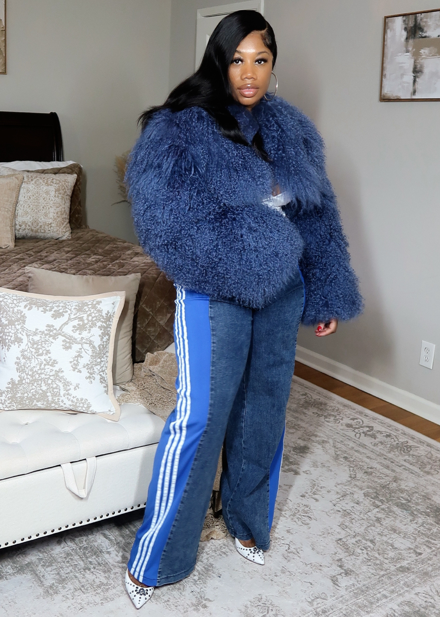 90% Polyester | 10% Spandex | 32' inseam | Model Wearing a large in red pants | A “Medium” would be more suitable for her size | we recommend sizing down they do have lots of Stretch | S- 2XL | expect lots of stretch | Side fabric is like a jersey material | Elastic waistband | Back pockets | Jeans have a vintage 90s look | Perfect for all seasons | High Demand